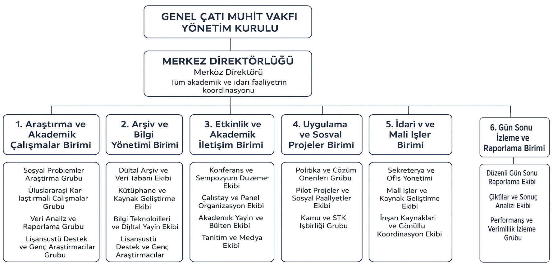 Yönetim KurulumuzAraştırma ve Literatür Birimi – Akademik yayınları derleyip arşivler.Saha Araştırmaları Birimi – Anket, mülakat ve odak grup çalışmaları yürütür.Veri Analiz Birimi – İstatistiksel ve sosyolojik analizler yapar.İletişim ve Yayın Birimi – Rapor, dergi, bülten ve sosyal medya içeriklerini hazırlar.Genç Araştırmacılar Birimi – Öğrencilere ve yeni akademisyenlere proje desteği sağlar.